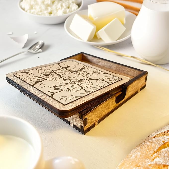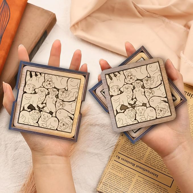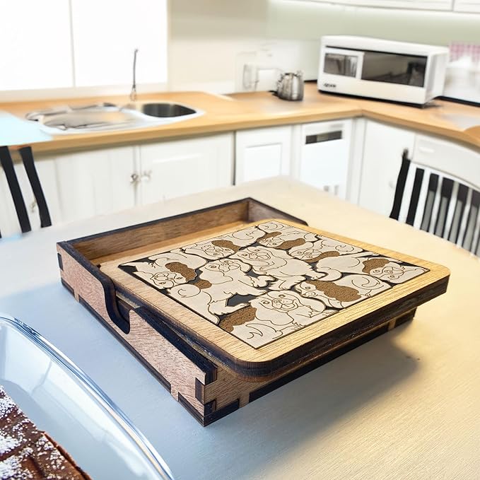 02 Pug Dog Coaster - Pug Dog Puzzle Wooden Coaster Set - Interlocking Jigsaw Drink Mats with Laser-Cut Design for Pug Lovers (Pug Dog) -