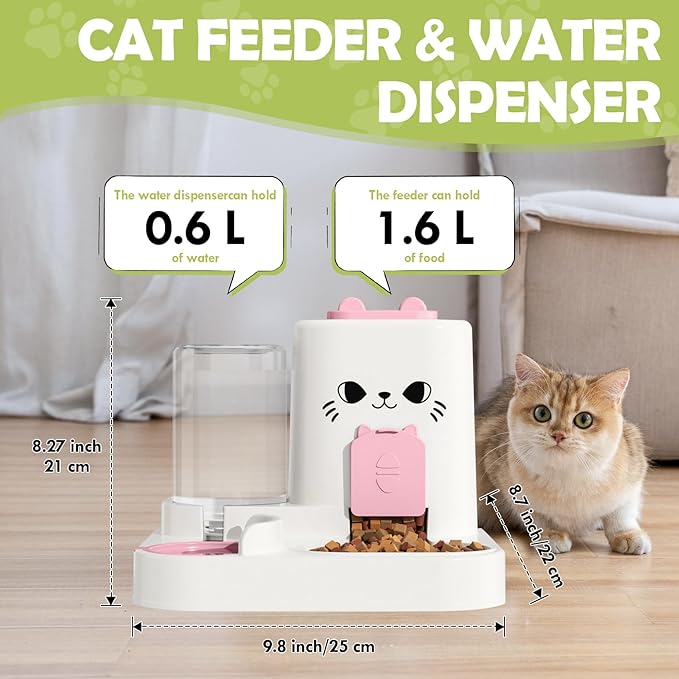 1.6L Auto Gravity Pet Feeder and 0.6L Water Dispenser Set, Automatic Cat Food and Water Dispenser, Gravity Pet Feeder for Small Medium Dog Puppy Cat Kitten (Pink) -