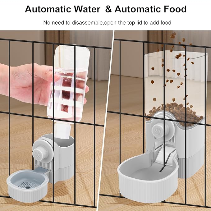 Hanging Cage Automatic Food Water Dispenser, Auto Gravity 1.2L Self-Feeding Feeder and 0.52L Waterer Set, Crate Auto Feeder Dish for Puppy Cats Ferret Bunny Guinea Pig Small Pets (Grey) -