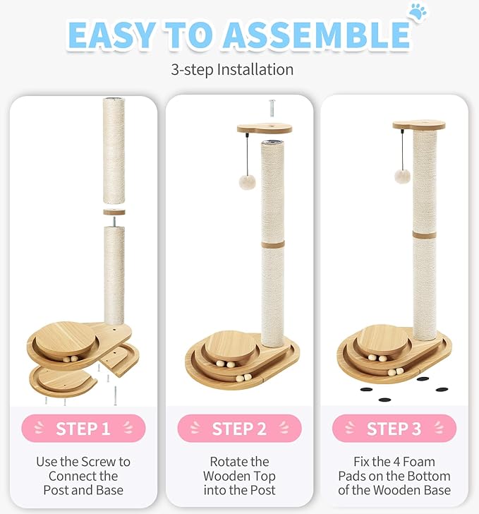Made4Pets Cat Scratching Post Cat Scratcher Kitten Toys for Indoor Cats Wooden Ball Track Two-Layer Modern Sisal 32" Tall Scratch Post Interactive Toy with Dangling Ball Large Size -