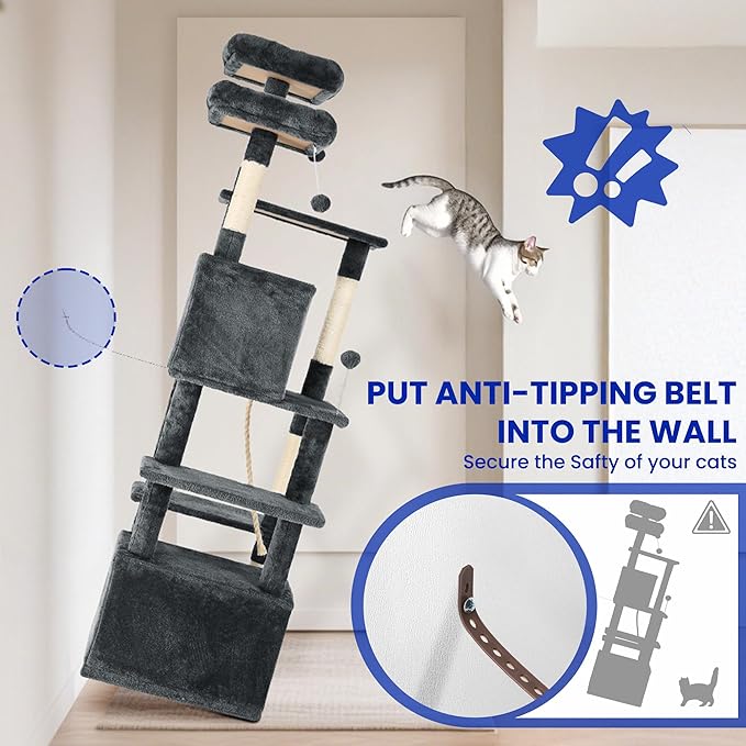 69-Inch Tall Cat Tree with Huge Condos, Multi-Functional Cat Tower with Top Perches, Scratching Posts, Pompoms, for Climbing, Lounging and Playing (Dark Grey) -