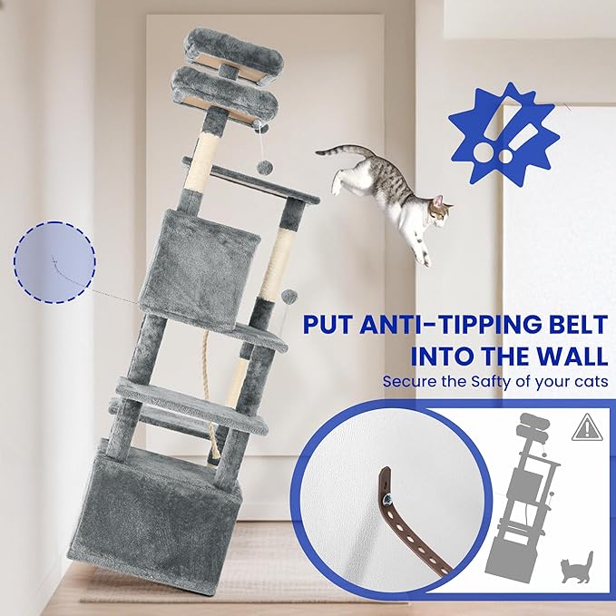 69-Inch Tall Cat Tree with Huge Condos, Multi-Functional Cat Tower with Top Perches, Scratching Posts, Pompoms, for Climbing, Lounging and Playing (Grey) -