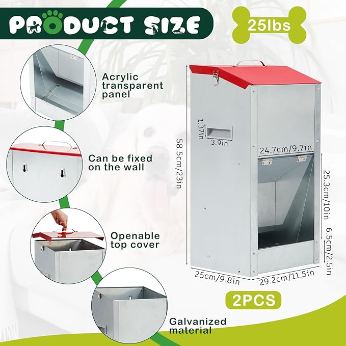Automatic Dog Feeder Large Food Dispenser 25lbs Outdoor Pets Feeder Gravity Food Feeder Galvanized Metal for Dog, Cat, Small, Medium, and Large Breeds -