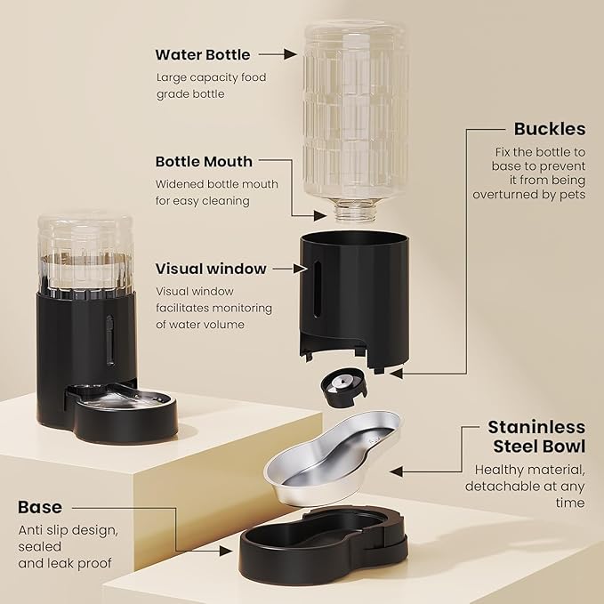 CZPET Automatic 4L/135Oz/1Gal Cat Water Dispenser with Stainless Steel Bowl, Gravity Waterer for Small Medium Dog Puppy Kitten (Black) -