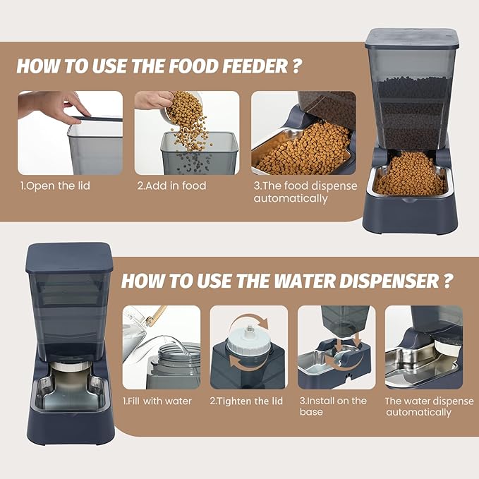 Cat Food Dispenser and Cat Water Dispenser Set with Stainless Steel Bowls Gravity Dog Feeder for Small Medium Big Cat Dog Pet Puppy Kitten, 1 Gallon x 2 -