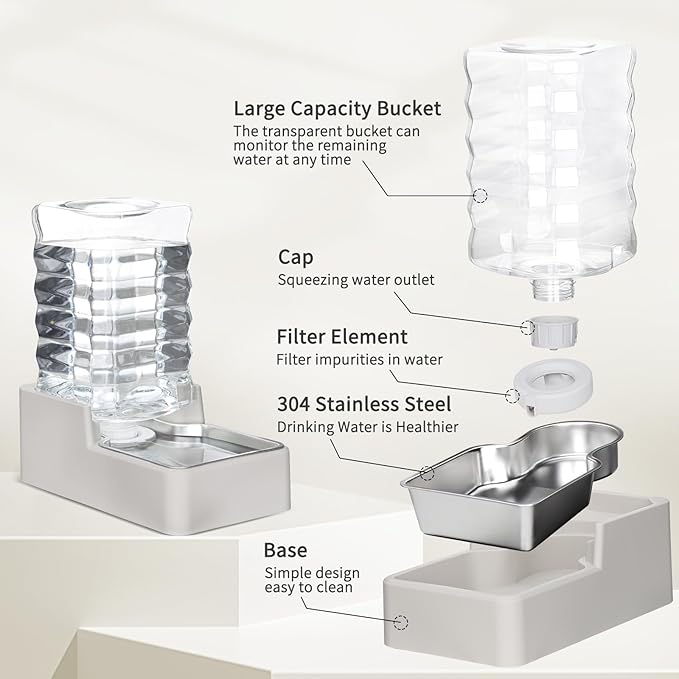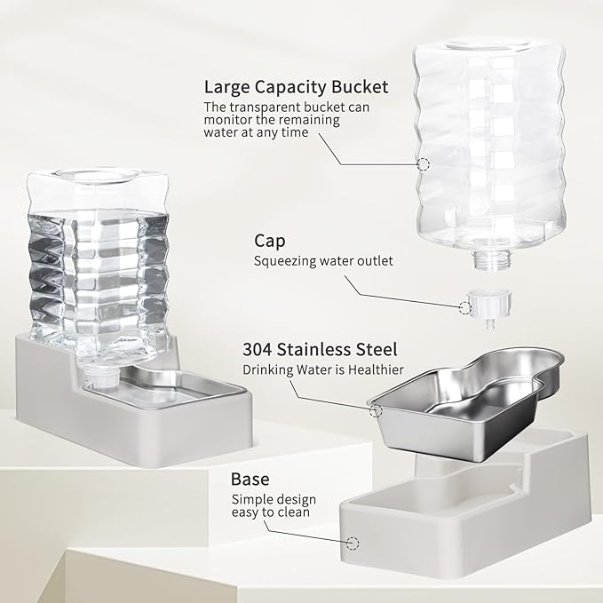 Cat Food Dispenser and Cat Water Dispenser Set with Stainless Steel Bowls Gravity Dog Feeder for Small Medium Big Cat Dog Pet Puppy Kitten, 1 Gallon x 2 -