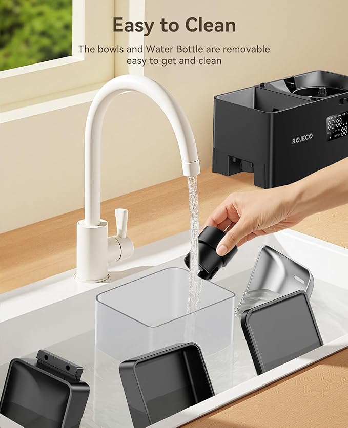 Rojeco 36Cups/8.5L Pet Automatic Cat Feeder and Gravity Water Dispenser,Stainless Steel Bowls 2-in-1 Set Large Capacity 5L Food Feeder and 3.5L Water Fountain for Cats,Pets,Small Dogs,Black -