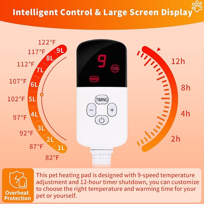 Dog Heating Pad, Waterproof Pet Heating Pad for Cats Dogs with 12H Timer & 9-Adjustable Temperature, Heated Dog Pad, Pet Heater Warmer for Cat Dog House Whelping Box Outdoor Indoor (18x18 Inches) -
