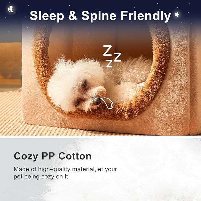 JIUPETY Cute Small Dog House Indoor, Foldable House Kennel Bed Mat with Cushion, L Size Tent Up to 25 Lbs, Dog Cave Bed with Non-Slip Bottom, Brown -