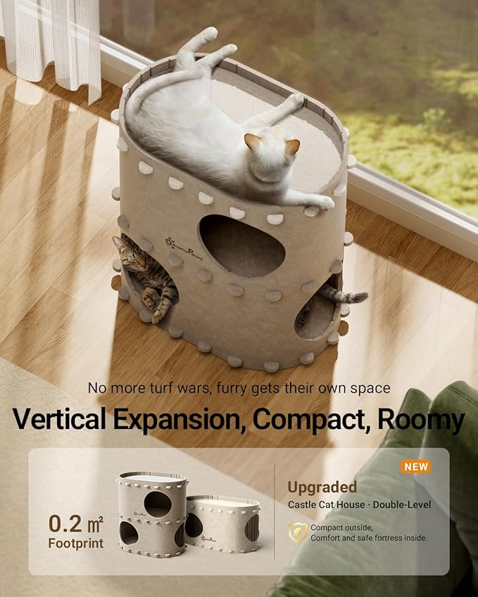 DownyPaws Cat House for Indoor Cats, 2-Storey Foldable Cat Bed Cave, Felt Cats Tunnel Bed Condo, Castle Kitten Cube Hideaway for Multicats, Scratch Resistant, Cream -