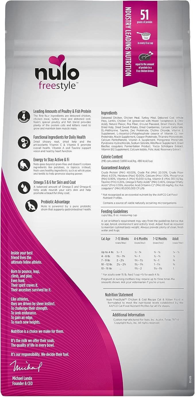 Nulo Freestyle High Protein Cat & Kitten Food, Chicken & Cod Recipe - Natural Grain-Free Dry Cat Food with Omega Fatty Acids & Probiotics, 2 lb Bag -