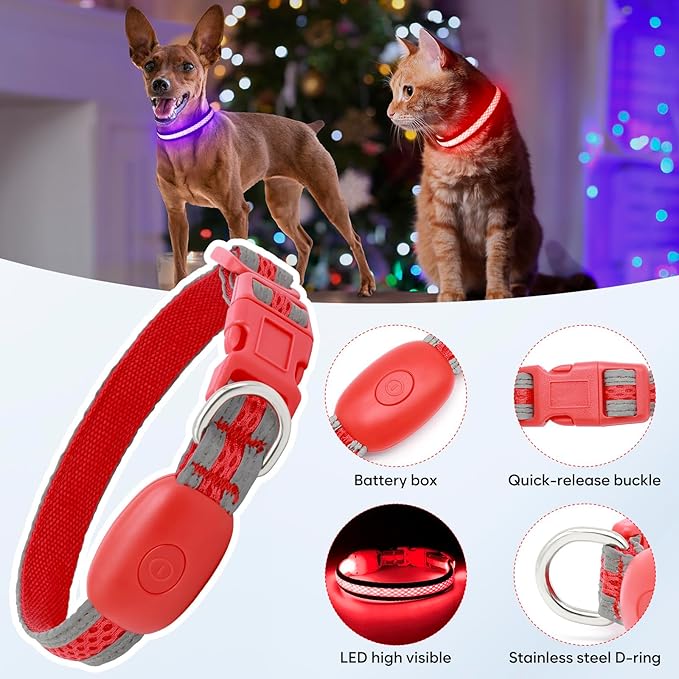 Flashseen LED Cat Collar,Light Up Dog Collar Rechargeable, Dog Lights for Night Walking, Comfortable Soft Mesh Pet Collar Adjustable for Cats Puppy and Small Dogs (Red, XS) -
