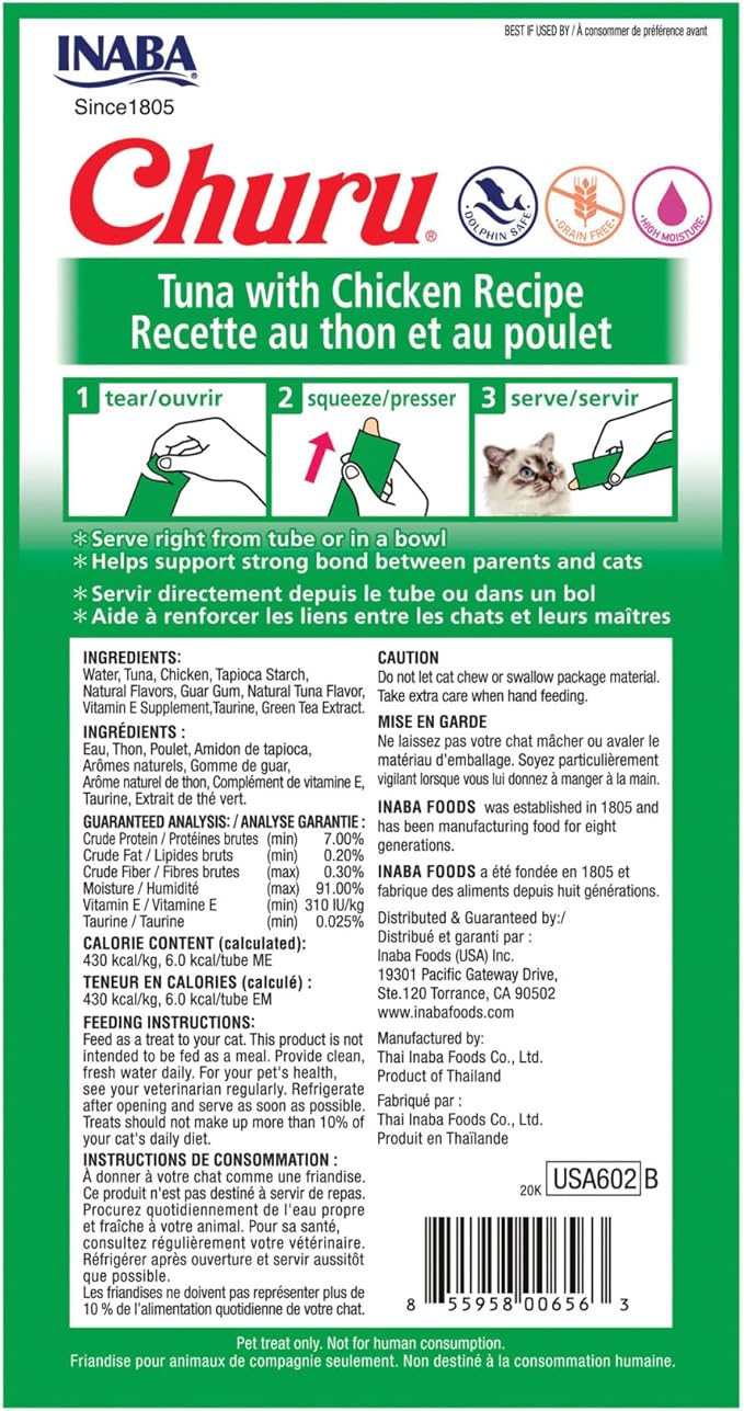 INABA Churu Cat Treats, Grain-Free, Lickable, Squeezable Creamy Purée Cat Treat/Topper with Vitamin E & Taurine, 0.5 Ounces Each Tube, 24 Tubes (4 per Pack), Tuna with Chicken Recipe -