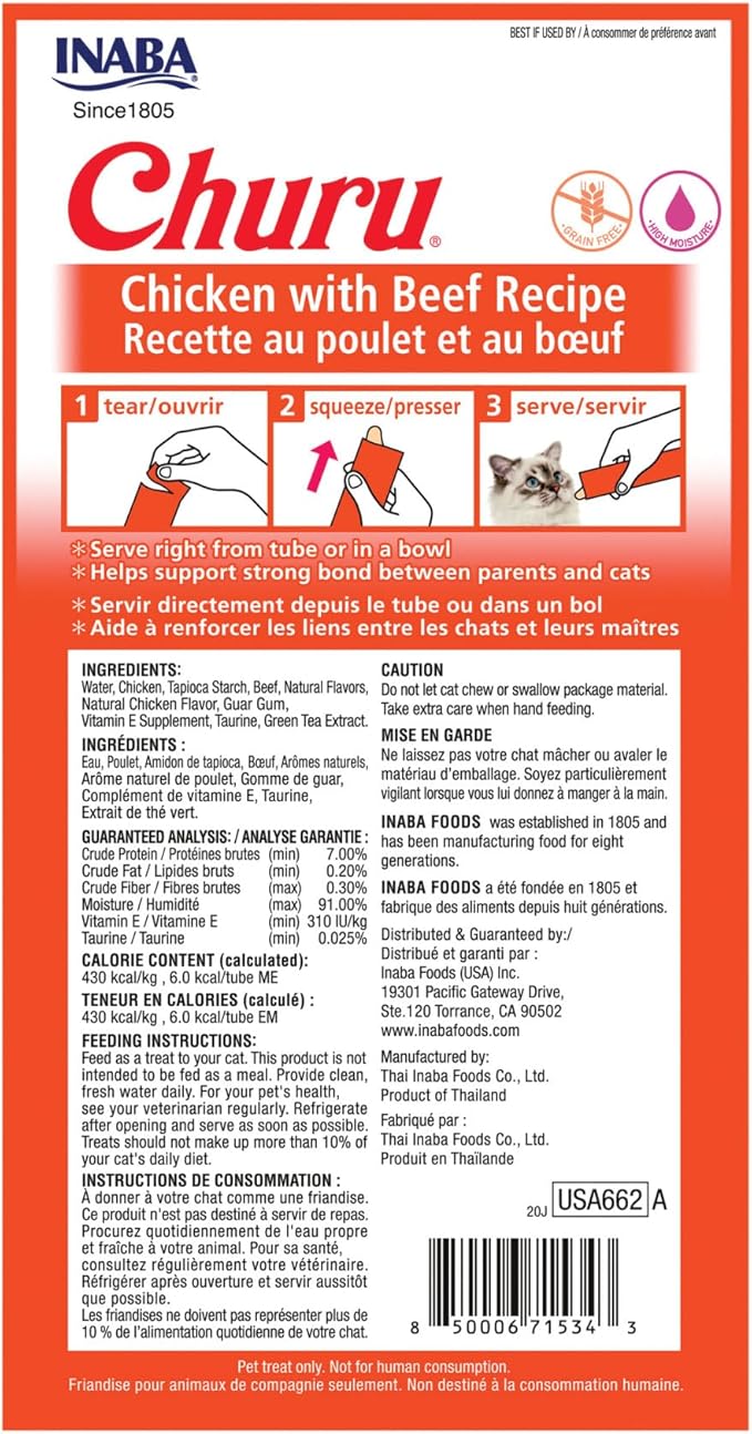 INABA Churu Cat Treats, Grain-Free, Lickable, Squeezable Creamy Purée Cat Treat/Topper with Vitamin E & Taurine, 0.5 Ounces Each Tube, 24 Tubes (4 per Pack), Chicken with Beef Recipe -