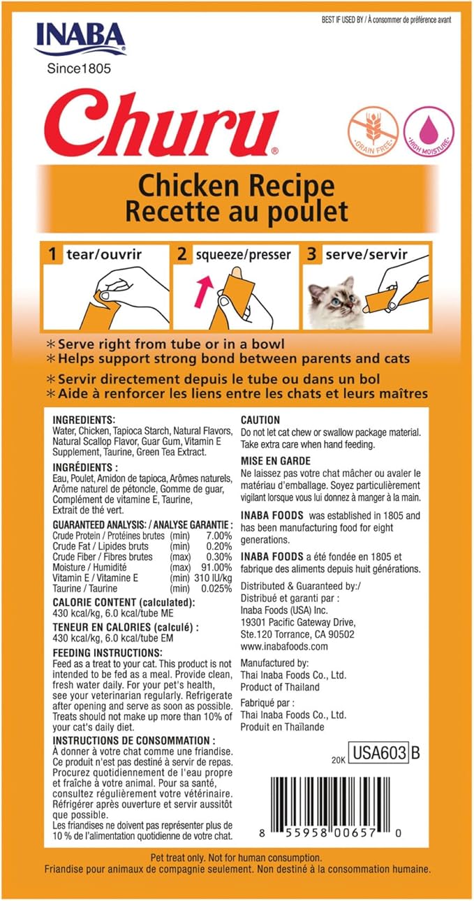 INABA Churu Cat Treats, Grain-Free, Lickable, Squeezable Creamy Purée Cat Treat/Topper with Vitamin E & Taurine, 0.5 Ounces Each Tube, 24 Tubes (4 per Pack), Chicken Recipe -