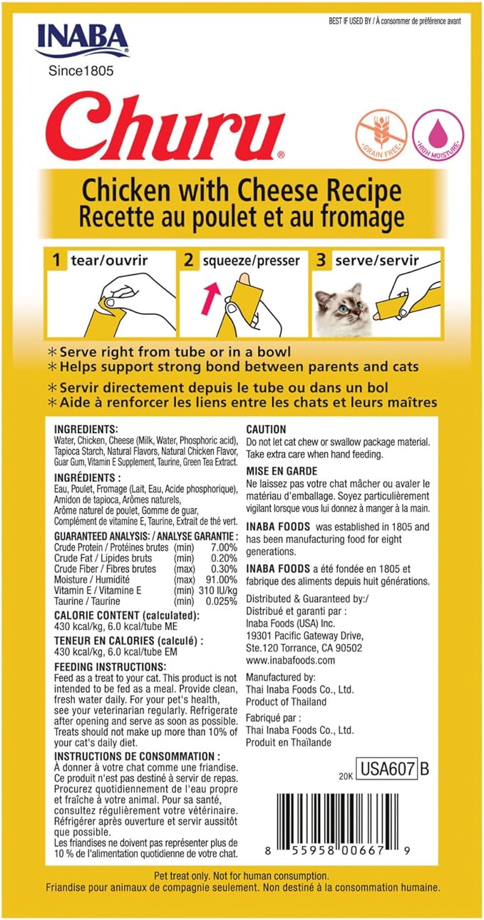 INABA Churu Cat Treats, Grain-Free, Lickable, Squeezable Creamy Purée Cat Treat/Topper with Vitamin E & Taurine, 0.5 Ounces Each Tube, 24 Tubes (4 per Pack), Chicken with Cheese Recipe -