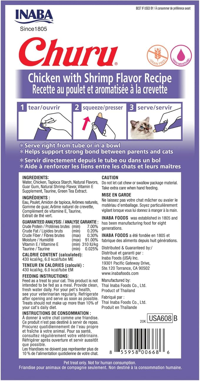 INABA Churu Cat Treats, Grain-Free, Lickable, Squeezable Creamy Purée Cat Treat/Topper with Vitamin E & Taurine, 0.5 Ounces Each Tube, 24 Tubes (4 per Pack), Chicken with Shrimp Recipe -