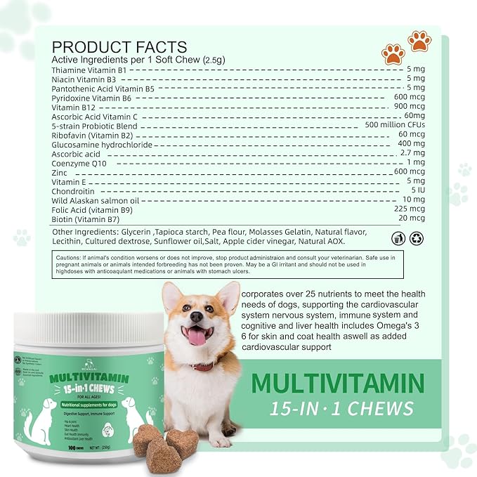 12-in-1 Multivitamin for Dogs - 120 Puppy and Senior Dog Vitamin and Supplement Soft Chews for Hip and Joint - Advanced Formula with Glucosamine, Omega 3,6,9, Vitamins, Probiotics, and More -