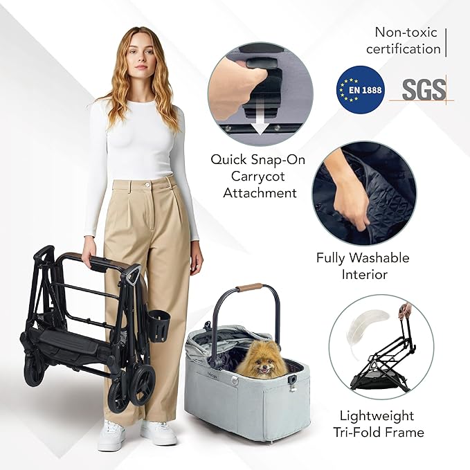 ibiyaya Tinker Pet Stroller for Small Dogs and Cats – 3-in-1 Pet Carrier, Dual-Opening Canopy, No-Flat Wheels, Vegan Leather Handle, Large Storage Basket (Sage Green) -