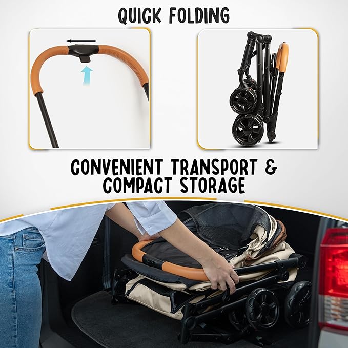 One-Click Folding Dog Stroller for 2 Dogs - 4 Wheel Jogger with Storage Pocket - Suitable for Pets Up to 110LBS (Beige & Grey) -