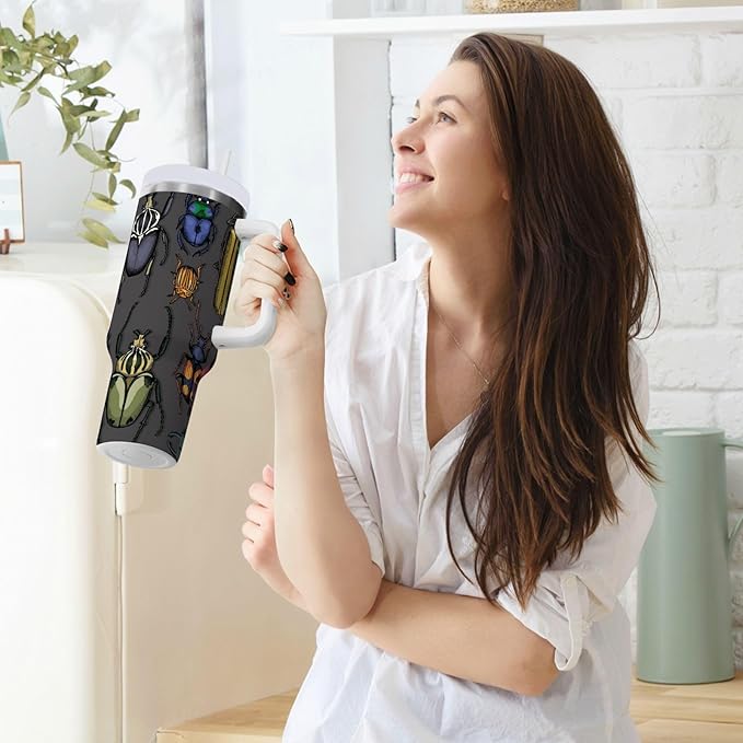 Boccsty Bright Insects Dark Insulated Tumblers Beetle Reusable Stainless Steel Tumbler 40 oz Cup Coffee Travel Mug Water Bottle with Handle & Flip Straw for Home Office Car -