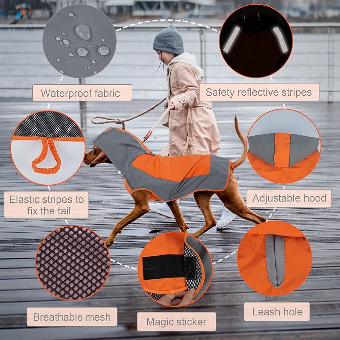 IECOii Dog Raincoat,Waterproof Rain Jacket for Medium Dogs,Adjustable Pet Rain Coat with Magic Sticker Closure,Reflective Doggy Raincoat with Hood,Perfect for Night Walking,Orange,M -