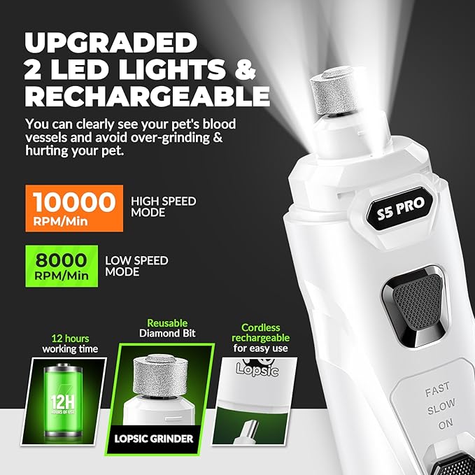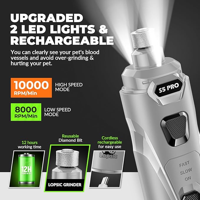 Dog Nail Grinder with 2 LED Lights Powerful 2 Speeds Super Quiet Dog Nail Trimmers with 3 Grinding Wheels Rechargeable Pet Dog Nail Clippers for Large Medium Puppy Dogs Dog Nail File Cat Nail Clipper -