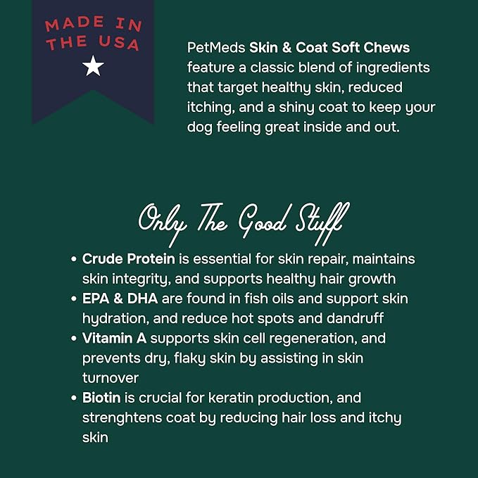 PetMeds Skin & Coat Supplement for Dogs - Fish Oil, Omega 3, Vitamin E, & Biotin for Dry, Itchy Skin & Shedding Relief - Healthy Skin & Shiny Coat - Beef & Sweet Potato Flavor - 60 Soft Chews -