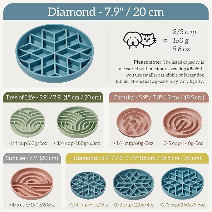 OHMO Slow Feeder Dog Bowls (Diamond, 8" Sage Green) Enrichment Soft Silicone Food Safe Feeding Bowl Non Slip Suction Cup for All Breed Pet, Cat Slow Down Eating Dishes, Boredom and Anxiety Reducer -