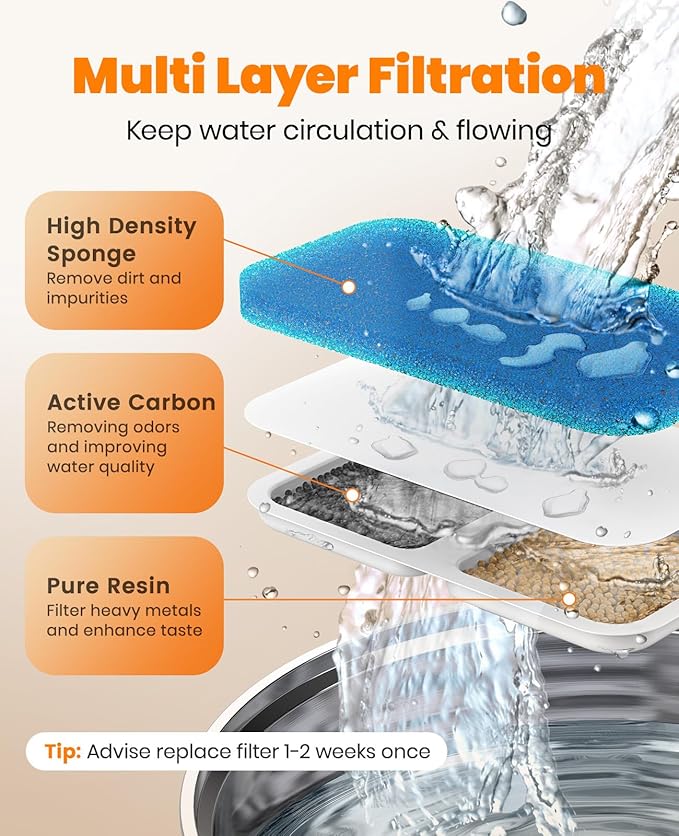 Cat Water Fountain - 3.2L/108oz Stainless Steel Pet Water Drinking Fountain for Cats Indoor, Dog Water Fountain with Water Level Window and 6 Filters + 6 Sponges -