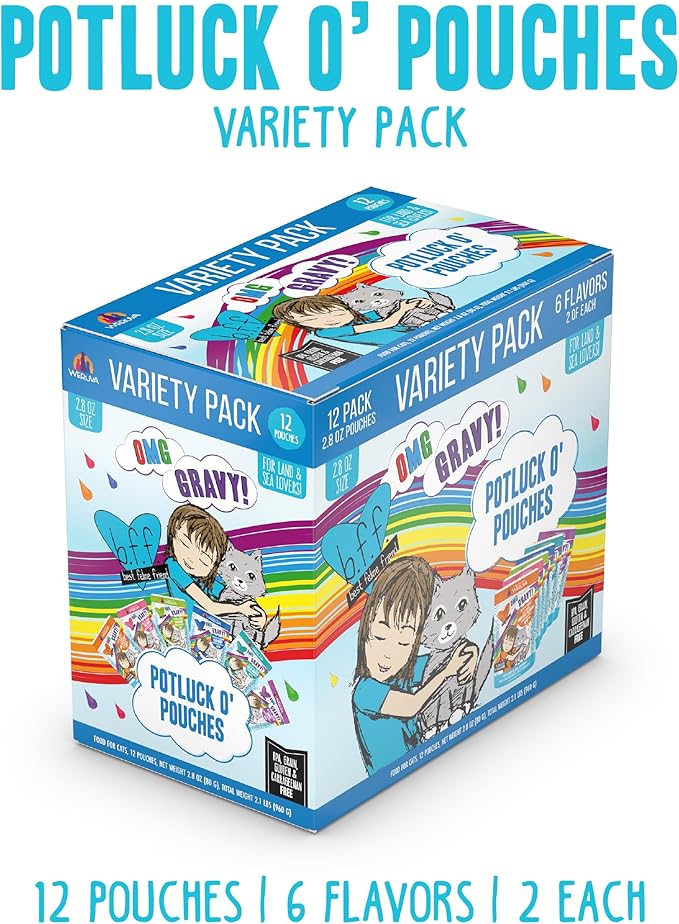 Weruva B.F.F. OMG - Best Feline Friend Oh My Gravy!, Variety Pack, Potluck O' Pouches, Wet Cat Food, 2.8Oz Pouches (Pack of 12) -