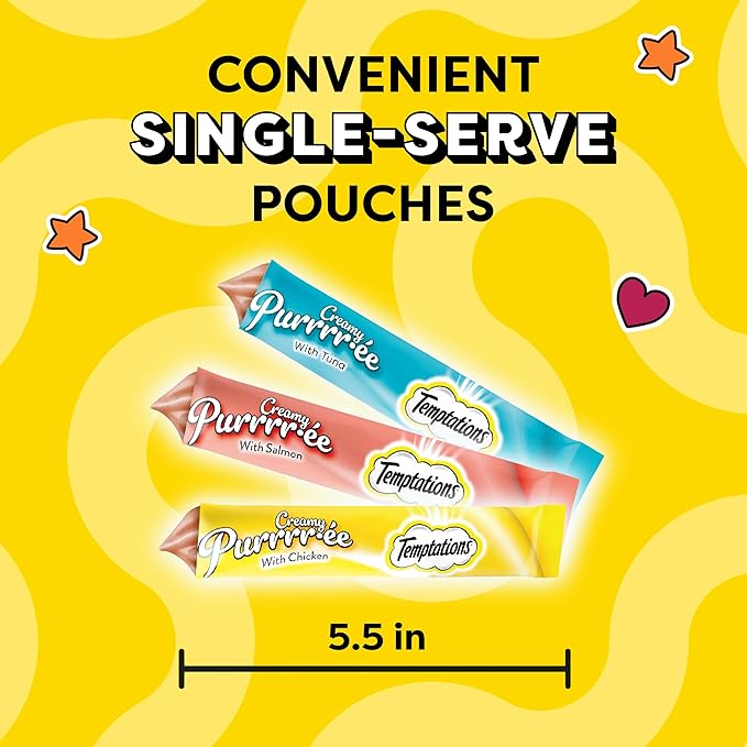 Temptations Creamy Puree Squeezable Lickable Wet Cat Treat with Chicken, Salmon, and Tuna Variety Pack, 0.42 oz. Tubes, 24 Count, Pack of 3 (72 Total) Temptations Creamy Puree Squeezable Lickable Wet Cat Treat with Chicken, Salmon, and Tuna Variety Pack, 0.42 oz. Tubes, 24 Count, Pack of 3 (72 Total)