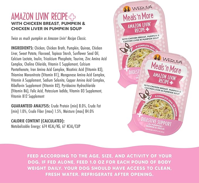 Weruva Meals 'n More Natural Wet Dog Food, Amazon Livin' Plus Digestive Support, 3.5oz Cup (Pack of 12) Weruva Meals 'n More Natural Wet Dog Food, Amazon Livin' Plus Digestive Support, 3.5oz Cup (Pack of 12)