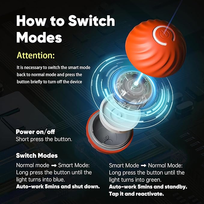 - Two Modes: This dog treat ball features an intelligent mode and a regular mode. The regular mode shuts off automatically after 5 minutes of operation, while the intelligent mode goes into sleep mode after 5 minutes of working and can be activated by tapping, which encourages your pet to play actively.